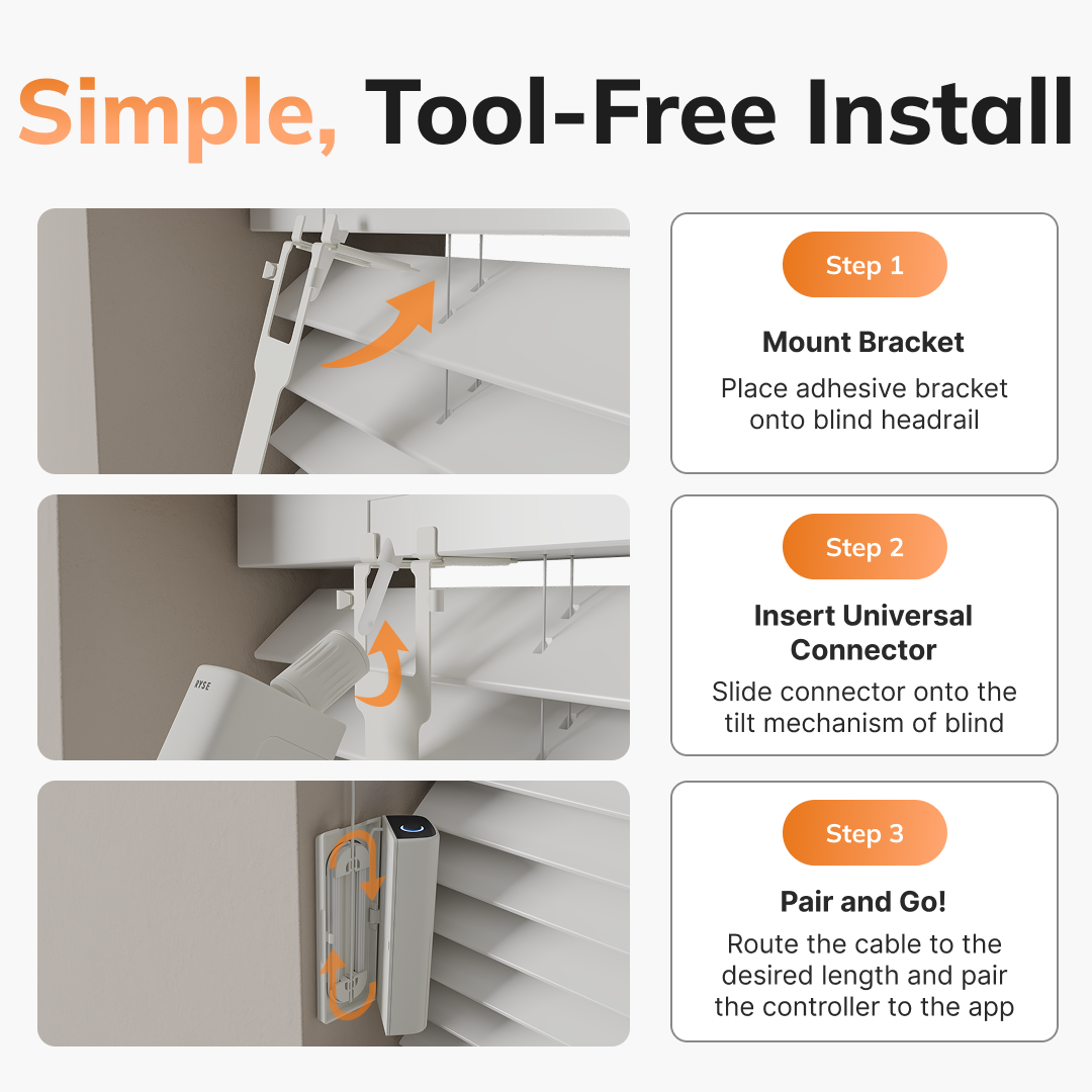 • POWERFUL HEAVY-DUTY MOTOR – Engineered for larger and heavier horizontal blinds, SmartBlind’s strong tilt motor smoothly adjusts slats with precision for reliable everyday performance.